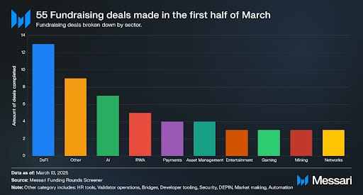 Beyond Binance, DeFi and AI are leading the funding race in March, with 13 DeFi deals and 7 AI deals so far.
