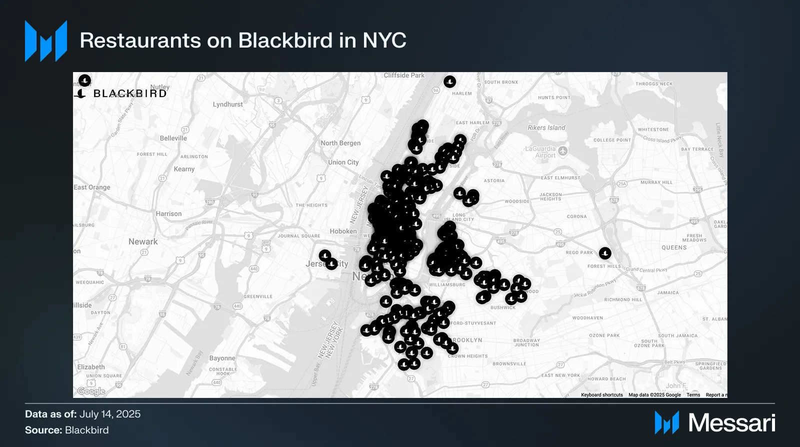 Blackbird is currently live in New York City, San Francisco, and Charleston, with ~1000 restaurants onboarded. While this is an impressive start, expansion will be necessary for accessing broader markets. As the network expands, Blackbird could become a canonical example in crypto’s consumer adoption by making everyday behavior, like eating out, more efficient and rewarding.