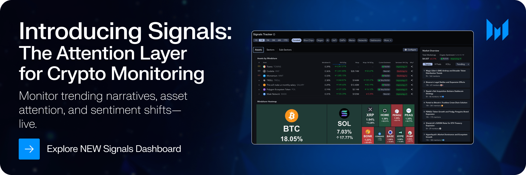 Messari’s new Signals dashboard lets you track real-time Mindshare and Sentiment across the crypto ecosystem, analyzing posts from notable accounts on X to quantify attention and tone shifts.
