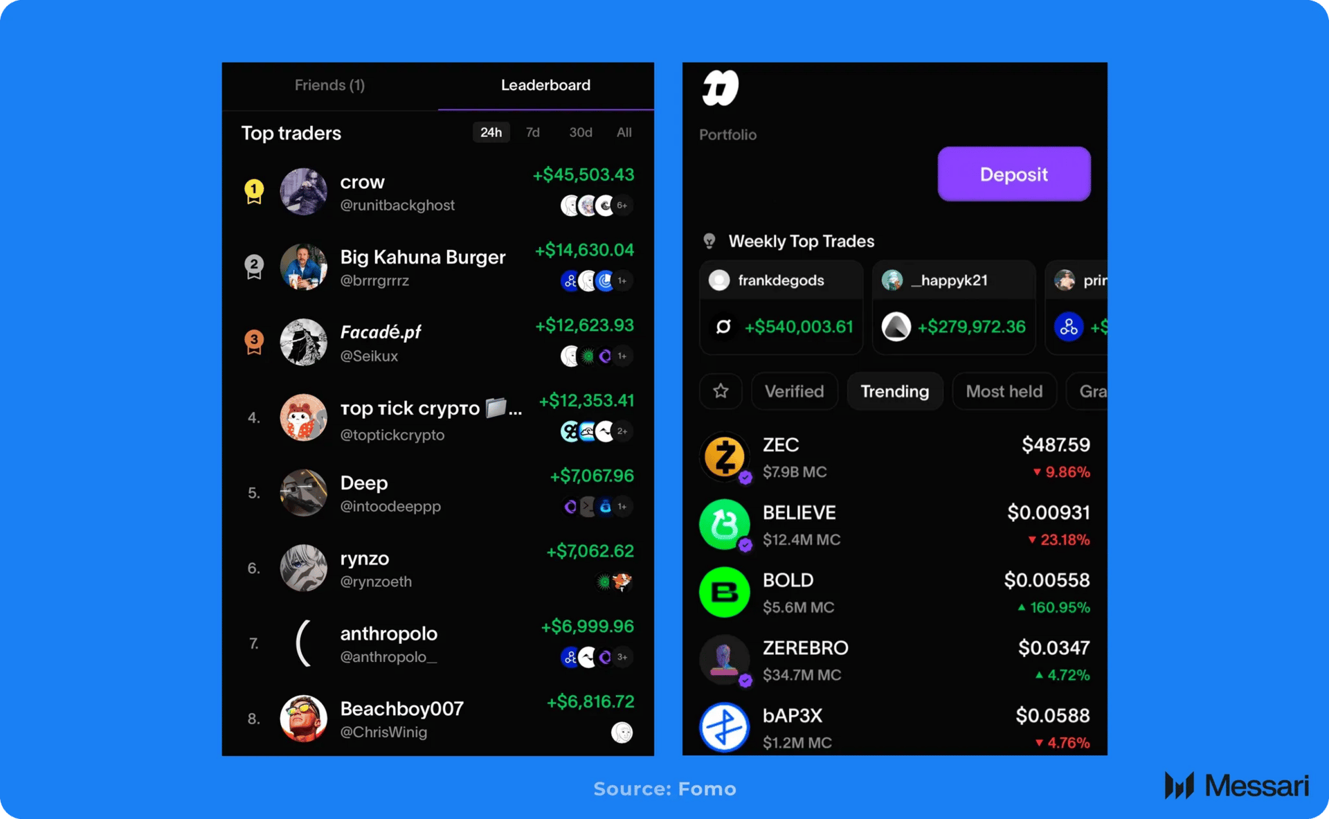 Each trade on fomo is publicly visible on one’s profile within the app, allowing users to follow others in real-time and view open positions. Social features, such as trader profiles, a referral system, and a public leaderboard, make positions and performance visible to other users through leaderboards and profiles.