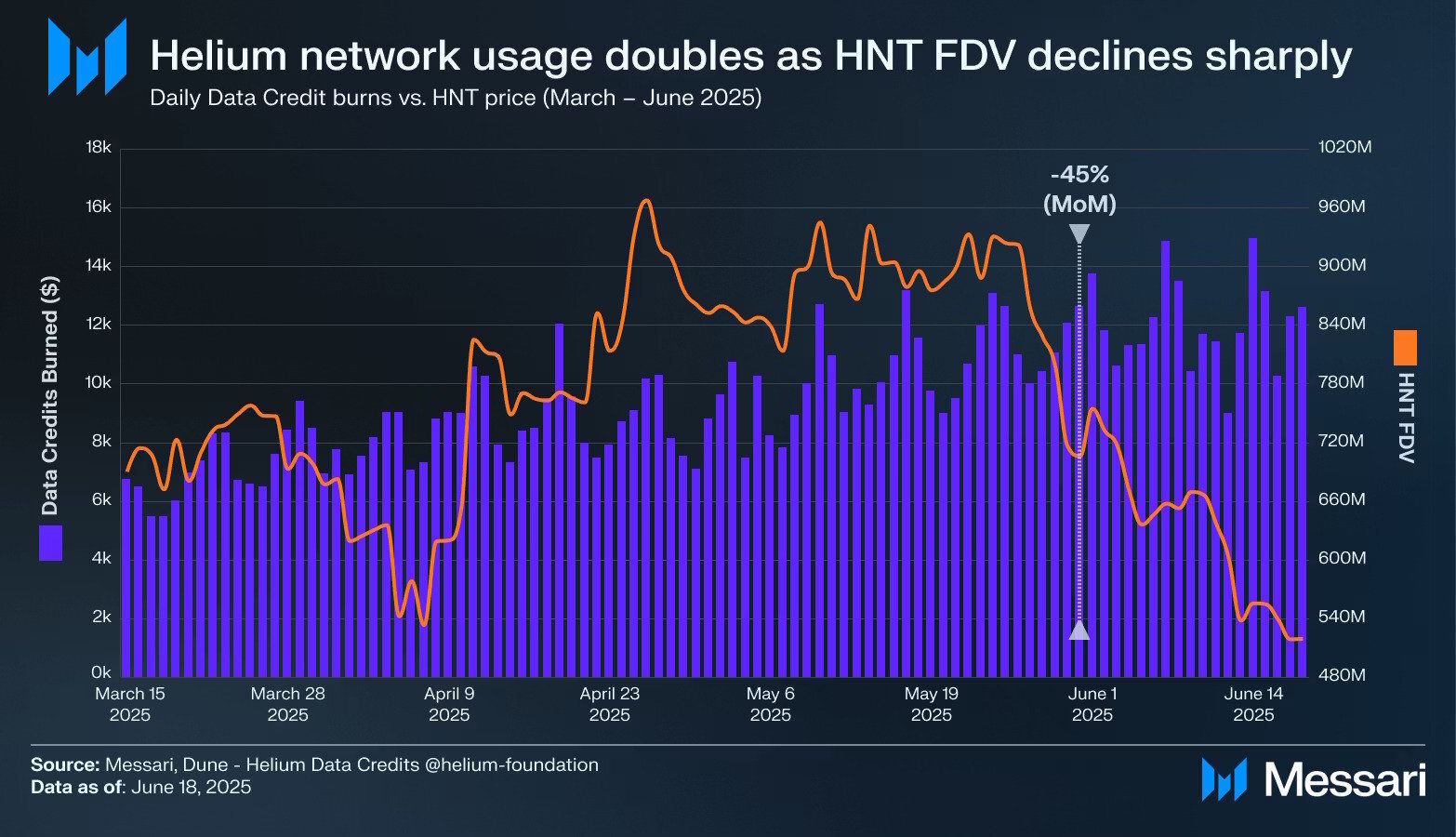 In our latest report, Look Up: A Helium Valuation and Catalysts for Growth, we unpack the growing disconnect between Helium’s on-chain fundamentals and HNT’s price performance. Despite generating $32M+ in annualized revenue and doubling its subscriber base in H1 2025, HNT has fallen over 60% year-to-date.