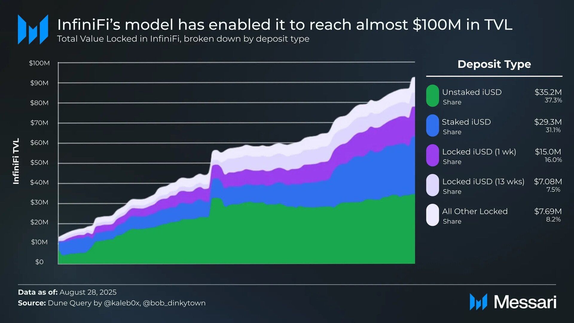 This design has incentivized holding iUSD: $27.3M (~29%) remains unstaked and not earning yield. Depositors still prefer short-term however as $29.9M is staked without lockup, and of the $37.0M locked, $16.7M is for one week. However, a large cluster at 13 weeks of $7M shows some investor preference for higher yield.