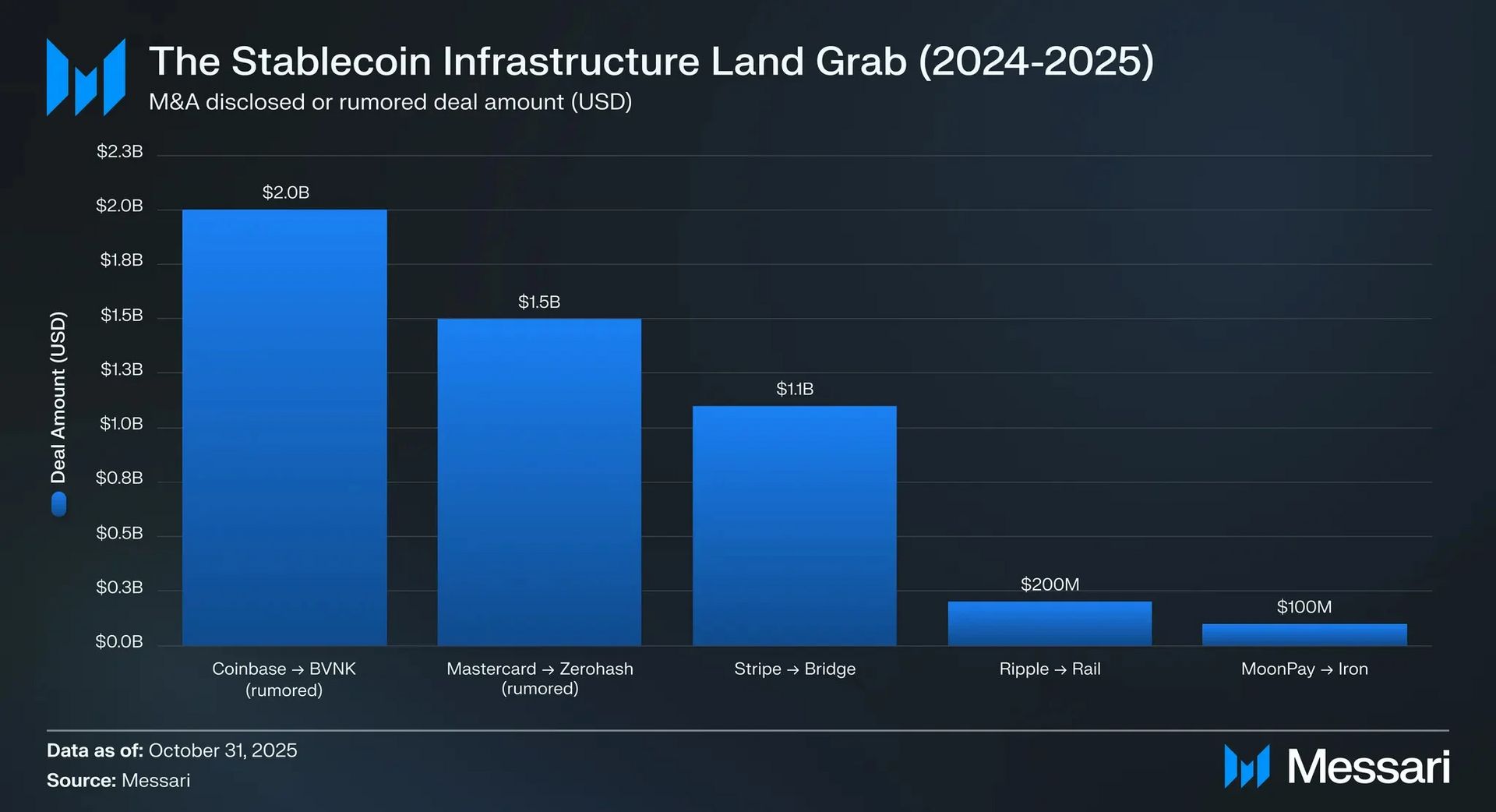 The timing of the deal underscores how aggressively incumbents are now moving. Zerohash reached unicorn status in September 2025 after raising $104 million at a $1 billion valuation, led by Interactive Brokers with participation from Jump Crypto, Morgan Stanley, SoFi, and more. A Mastercard acquisition in the $1.5-2 billion range would represent a 50-100% return for late-stage investors within a single quarter, a premium that reflects the cost of speed. For Mastercard, buying a fully licensed, production-grade infrastructure provider is faster than building one.