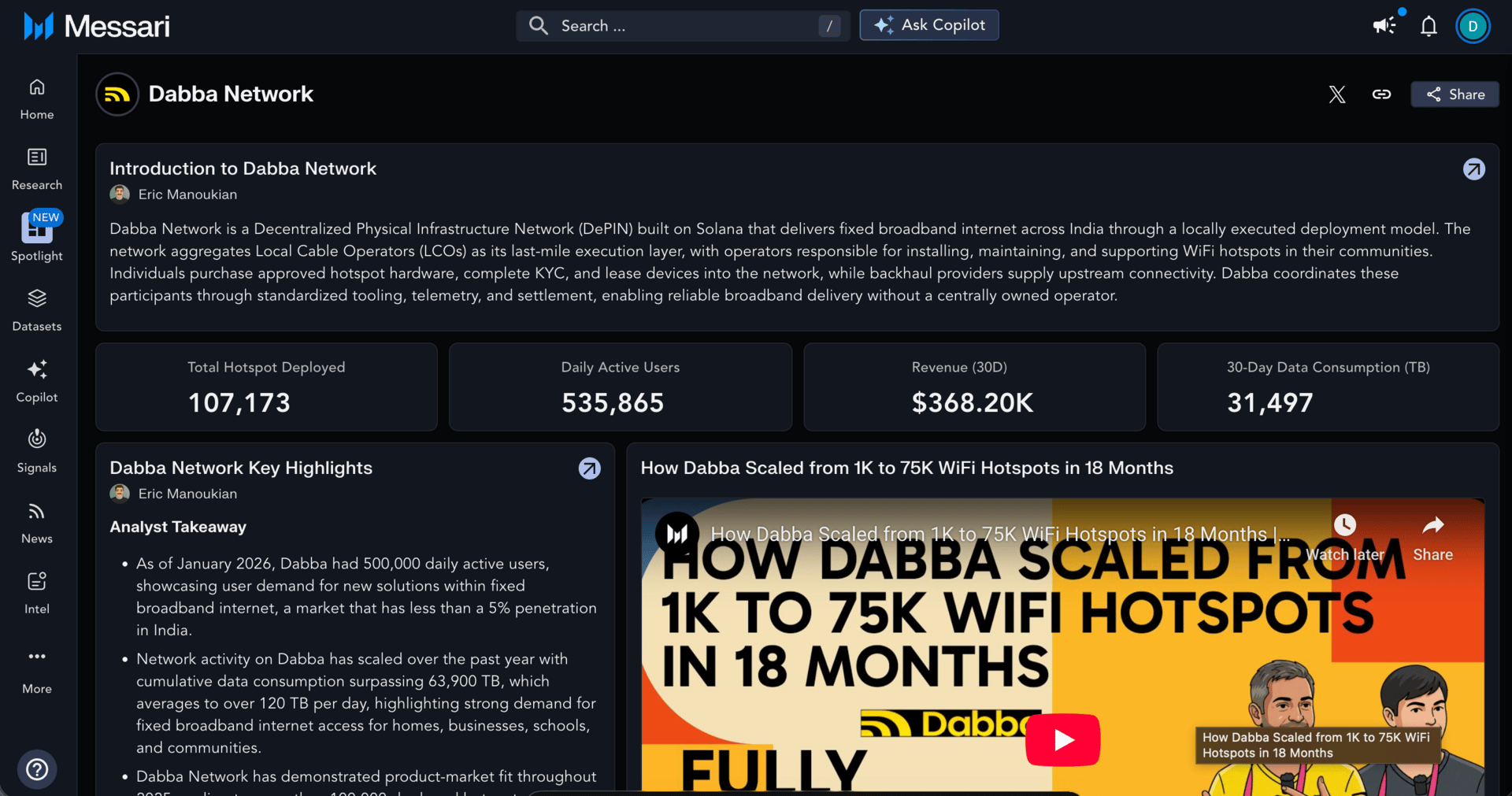 Our first Spotlight features Dabba Network. It shows how decentralized connectivity adoption is evolving through real usage data, paired with analyst insight. It is a clean example of how projects can shape their narrative using trusted Messari data and context.