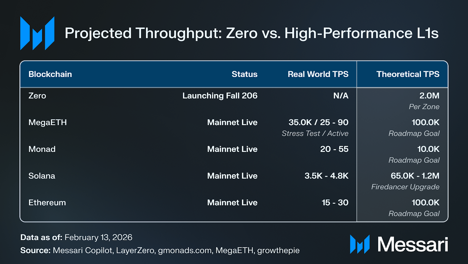 The fundraising coincided with the announcement of Zero, LayerZero’s new Layer 1 blockchain. Zero introduces an architecture that separates transaction execution from verification using zero-knowledge proofs, allowing computation to occur once while verification remains distributed. According to LayerZero, the system is designed to scale to approximately 2 million transactions per second (TPS), positioning it as the most ambitious high-throughput blockchain architecture announced to date. Zero will also use ZRO as its native token used for transaction fees, staking, and governance.