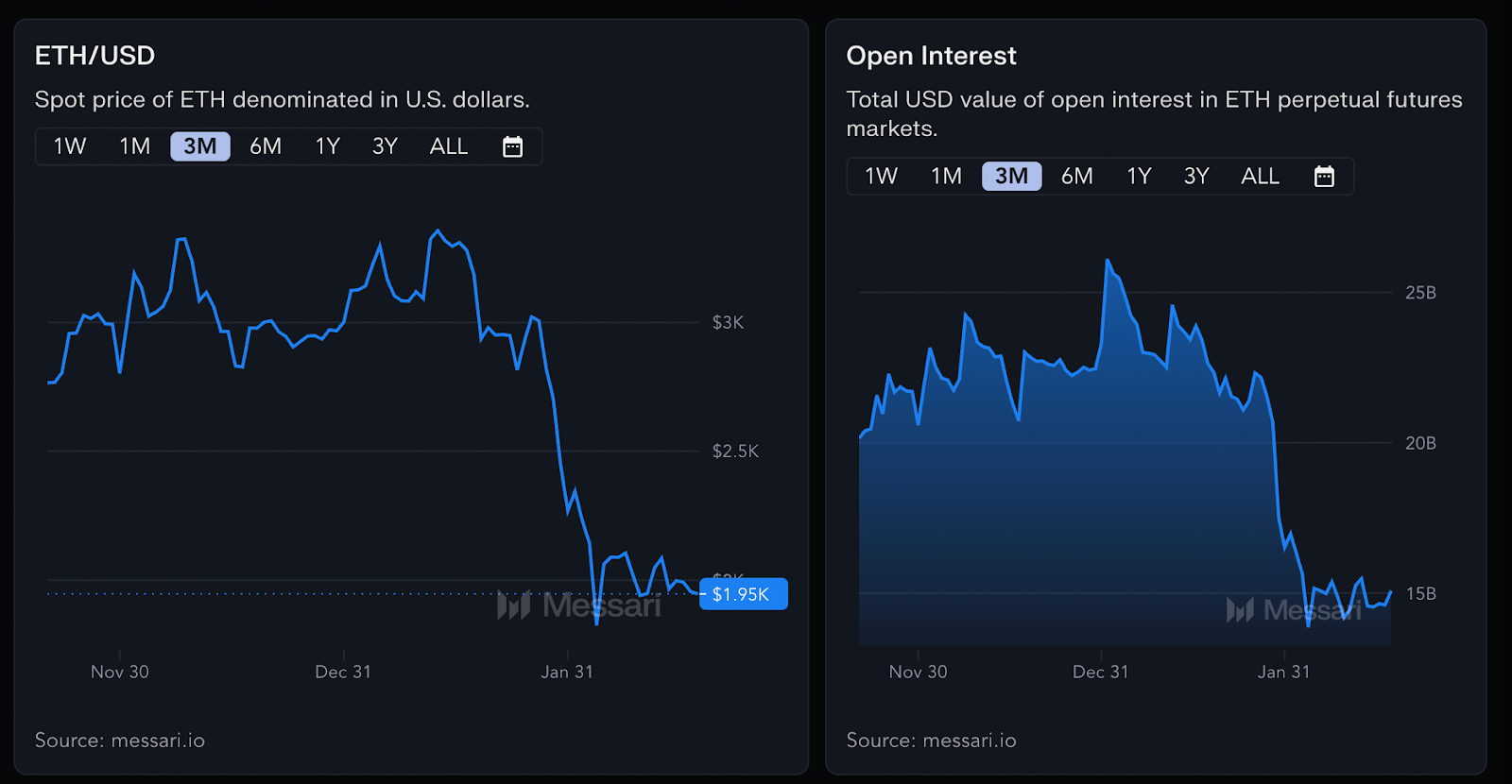 ETH now sits just below $2,000, down roughly 33% year-to-date. Open interest has also unwound, falling back to April 2025 levels (~$14.5 billion), driven in part by the combined multi-billion-dollar liquidations of Garret Bullish and Trend Research.