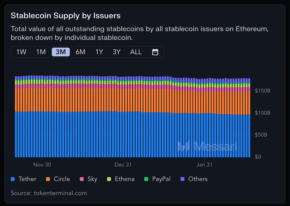 Despite the decline in prices and DeFi TVL, stablecoin activity on Ethereum has remained resilient. Total stablecoin market cap has fallen only marginally, from a peak of $185.48 billion on November 2, 2025, to $178.22 billion as of February 16, 2026 (down 4%).