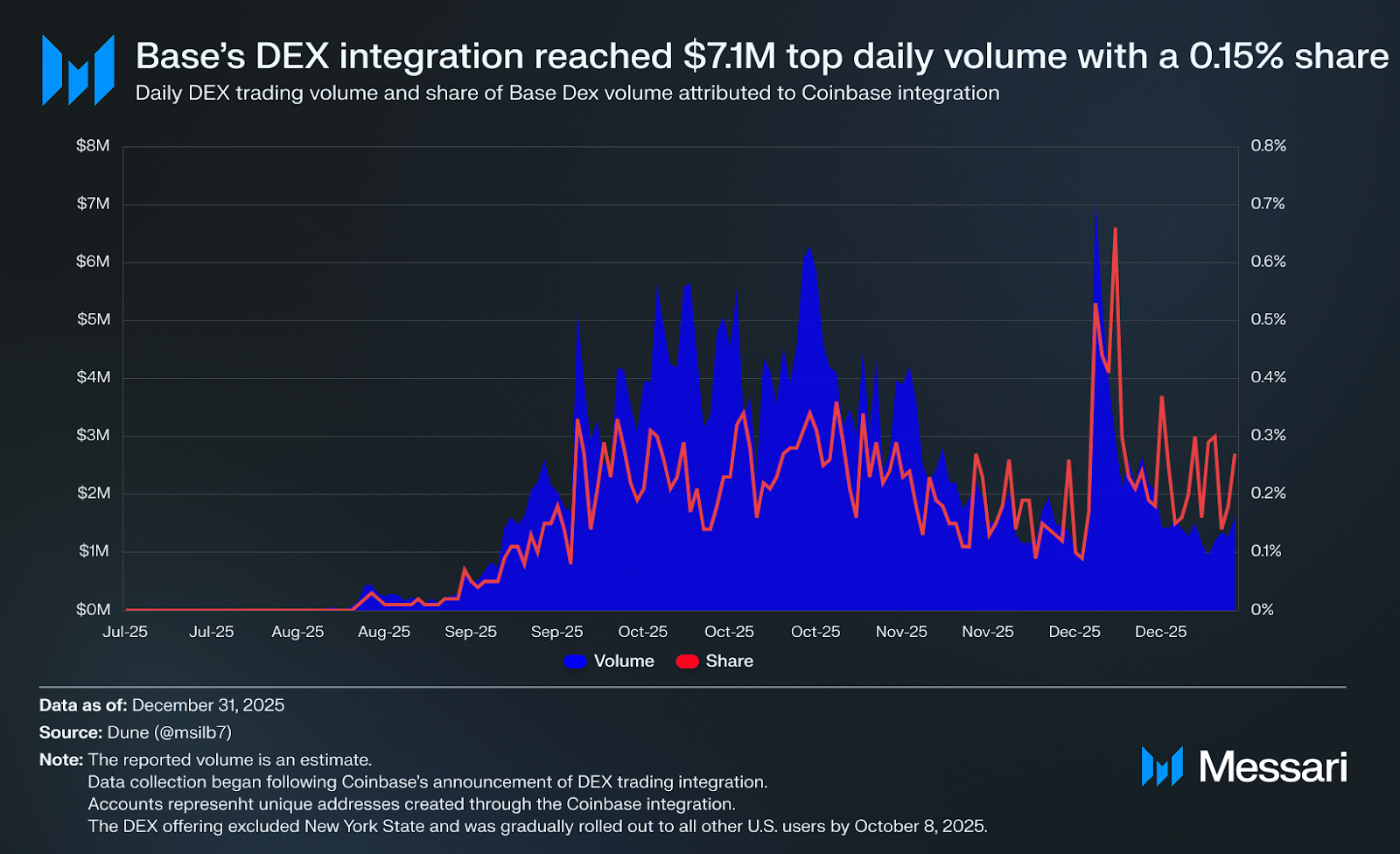 Coinbase’s recent DEX integration on Base is a clear example. By allowing U.S. users to trade Base-native tokens directly inside the Coinbase app, the exchange removed a major behavioral hurdle: the need to consciously “go DeFi.” Since its August 2025 launch, the feature has generated millions in DEX volume on Base and driven the creation of up to 10,000 new Coinbase-linked addresses per day.