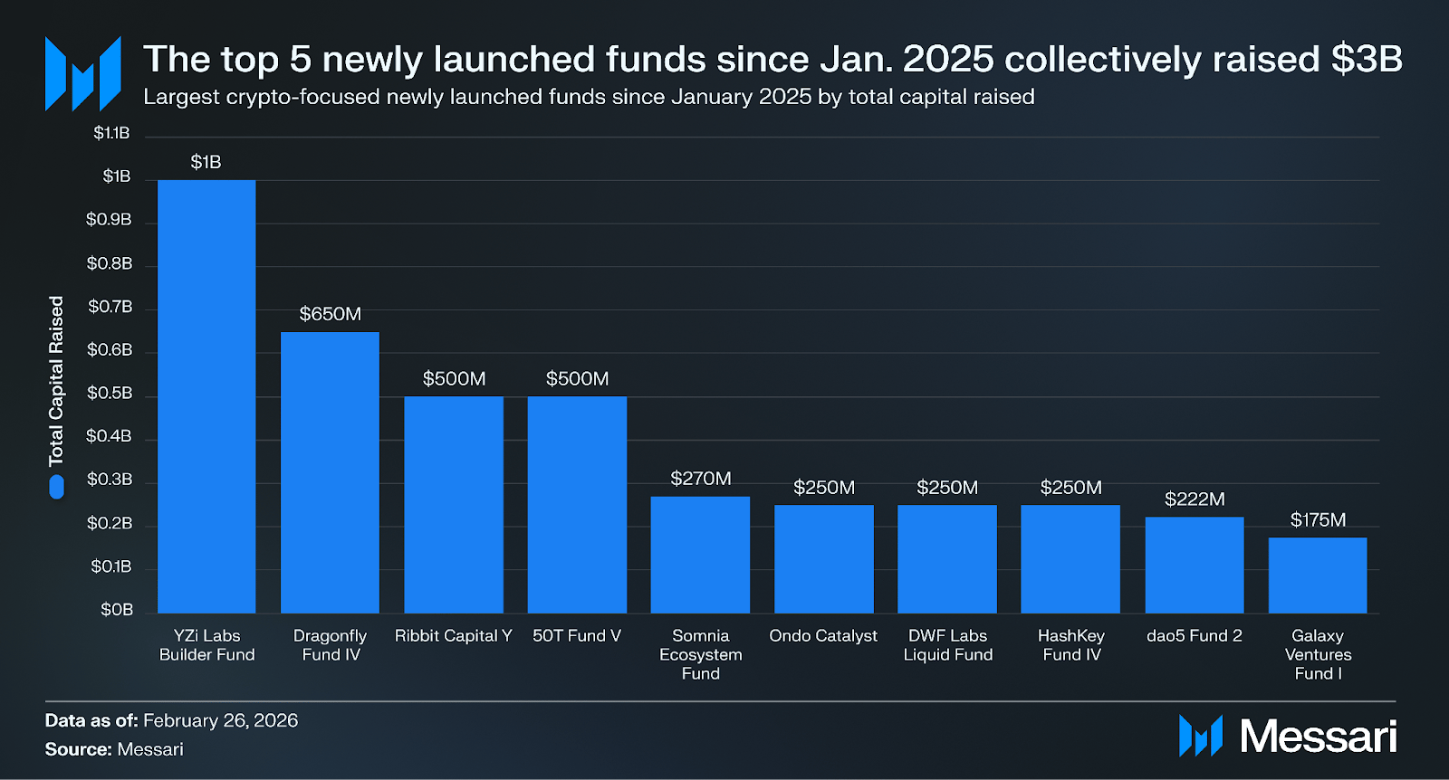 Dragonfly closed an oversubscribed $650 million fourth fund last week, while many crypto venture firms are struggling to raise at all. Since January 1, 2025, $7 billion has been raised across crypto-focused vehicles. Within that pool, the top five raises alone total about $3 billion, or ~40% of all capital raised, led by YZi Labs’ $1 billion Builder Fund and Dragonfly’s Fund IV.