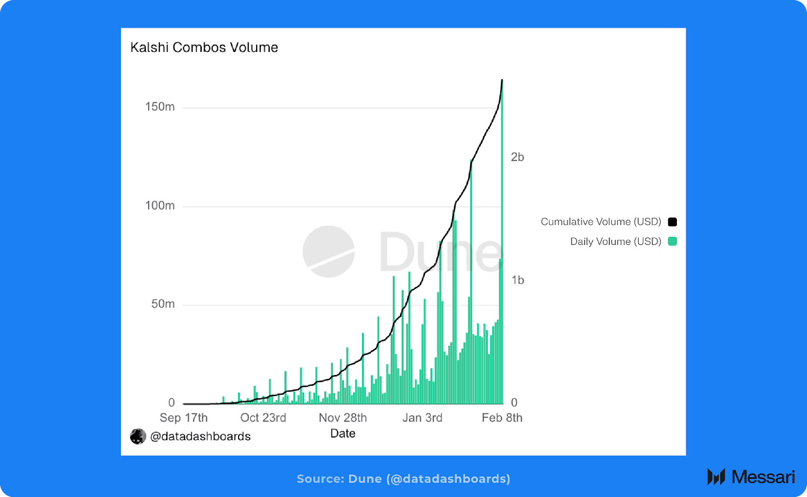 Kalshi's “combos” markets hit $164.66 million in volume on February 8, nearly triple the typical daily baseline of under $50 million. Cumulative combos volume reached a record $2.65 billion by game day, up from near zero in mid-September.