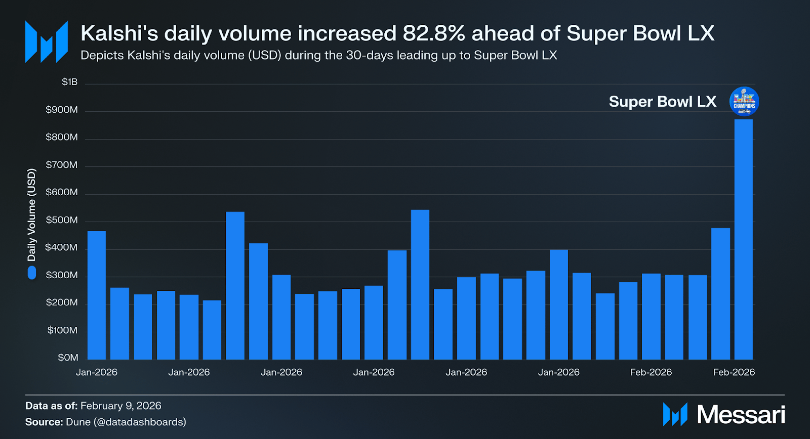 Kalshi recorded $871 million in volume on February 8, an 82.76% day-over-day increase. The platform's cumulative volume crossed $39 billion by game day, driven by steady daily activity in the $200-$400 million range throughout January, before the final week's surge.