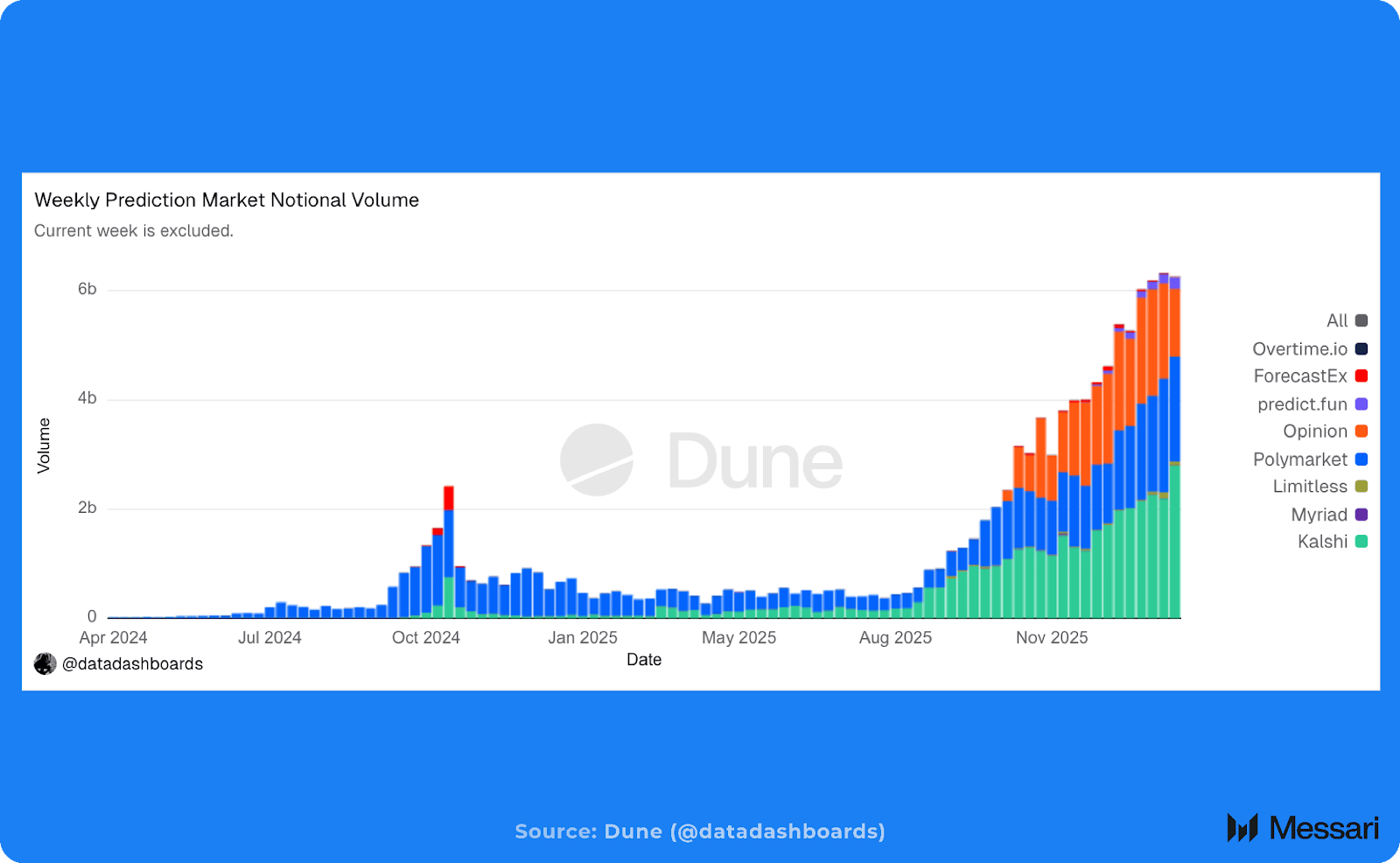 Prediction market platforms recorded $6.26 billion in trading volume during the seven days ending February 2, the week before Super Bowl LX. Kalshi led at $2.79 billion, followed by Polymarket at $1.915 billion. Opinion captured $1.24 billion, while predict.fun, Limitless, and smaller platforms split the remainder.
