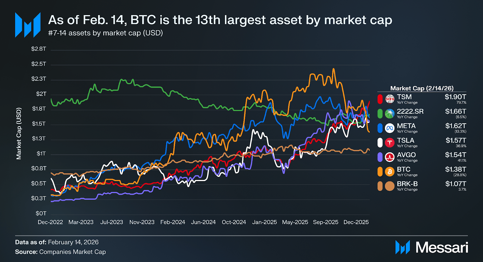 s of Feb. 14, BTC is the 13th-largest asset by market capitalization, down five spots from the eighth-largest asset at the end of 2025. Year-over-year, BTC has performed the worst among these assets, declining 28.8% to a market cap of $1.38 trillion, while silver performed the best, increasing 137.3%. Amidst extended inflation (monetary debasement) and with the U.S. dollar as the global reserve currency, BTC competes not only against traditional stores of value like gold and silver, but also against perceived blue-chip U.S. equities, specifically U.S. tech giants, as evidenced by their expanding price-to-sales (P/S) ratios. For example, Apple’s P/S has expanded from 5.3 at the end of 2022 to more than 8.7.