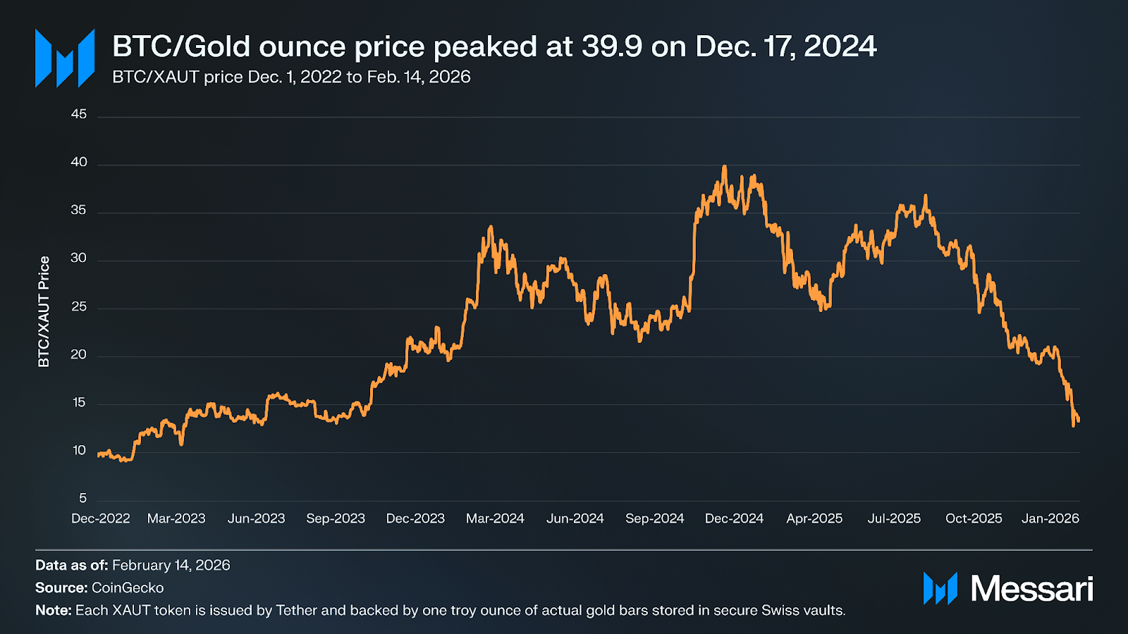Since Dec. 1, 2022, when BTC’s price was $17,200 to Jan. 4, 2026, when it was $90,600, the BTC to gold ounce price has ranged from a low of 9.2 (Jan. 4, 2023) to a high of 39.9 on Dec. 17, 2024. Even as BTC made successive new all-time highs in 2025, reaching peaks of $123,600 in August (+33.4% YTD) and $124,800 in October (+34.7% YTD), it failed to reach a new all-time high against gold. This was due to the price of an ounce of gold increasing from $3,350 on Aug. 14, 2025, to $5,060 as of Feb. 14, 2026, while BTC declined. Beginning Jan. 20, the BTC-to-gold ounce price began breaking down from the 19-39 range it had held since the last bear market, bottoming at 12.78 on Feb. 6.
