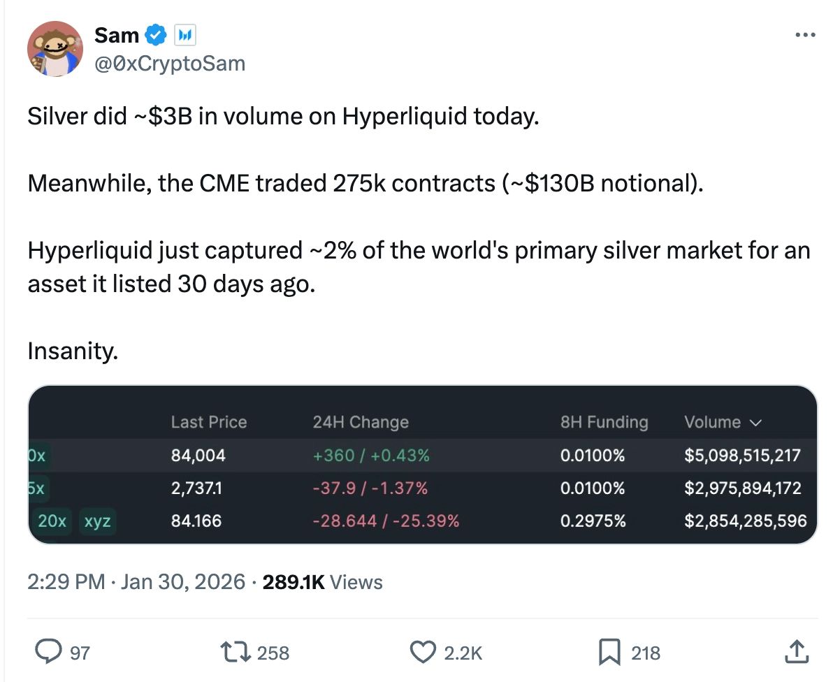 This is not the first time Hyperliquid has punched into TradFi-adjacent territory. Earlier this year, the platform's silver market (SLV) hit a single-day peak of $3.4 billion, representing nearly 2% of CME silver's average daily volume. Both CL and SLV do significant volume during the week when traditional futures markets are open, and tend to see the largest absolute volume on weekdays rather than weekends. But the most notable spikes relative to baseline consistently emerge around macro shock events.