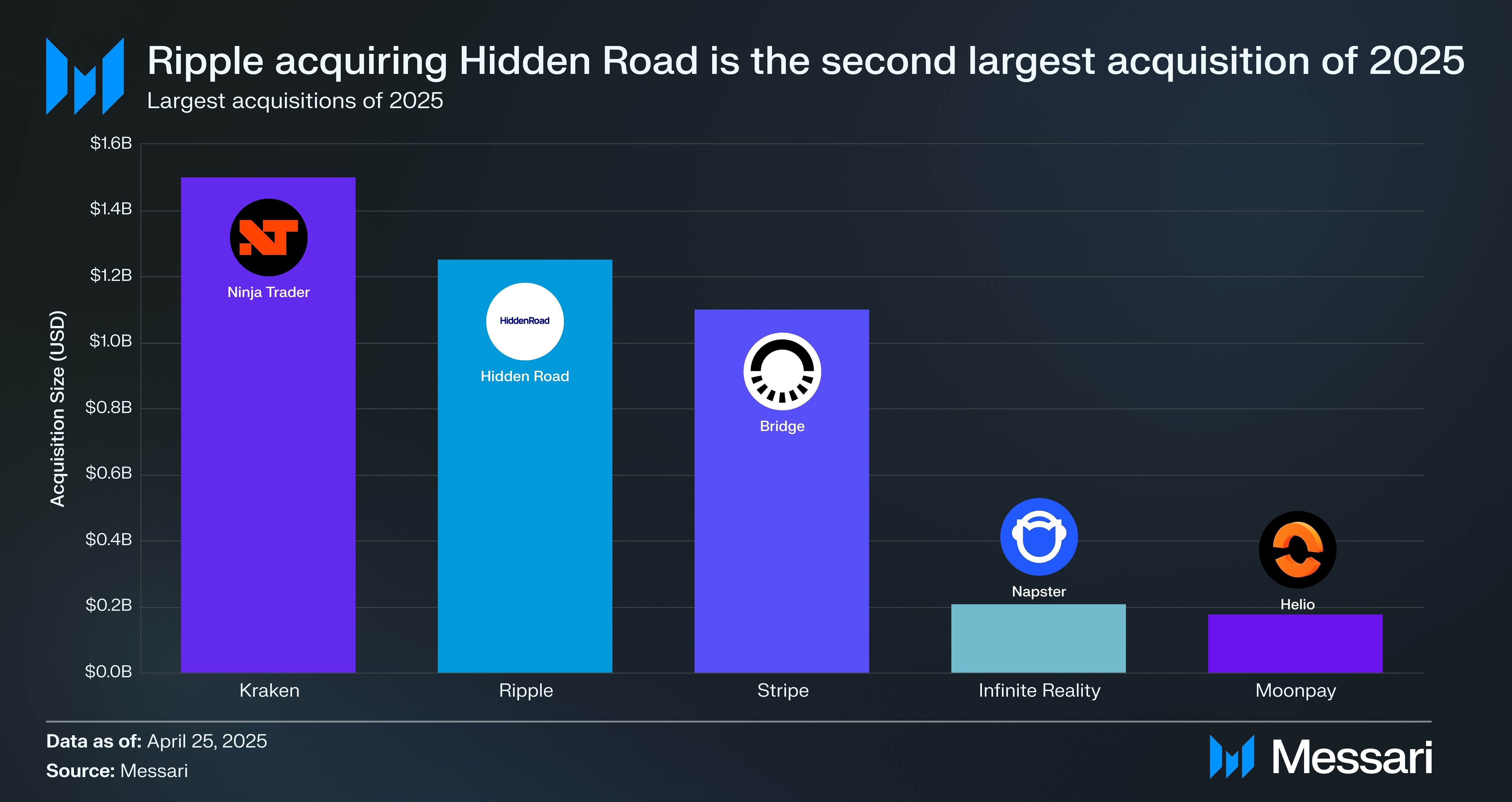 April 21, 2025 - Ripple has officially acquired global prime brokerage firm Hidden Road for $1.25 billion, marking the second-largest acquisition of 2025 and one of the largest acquisitions in the history of digital assets.