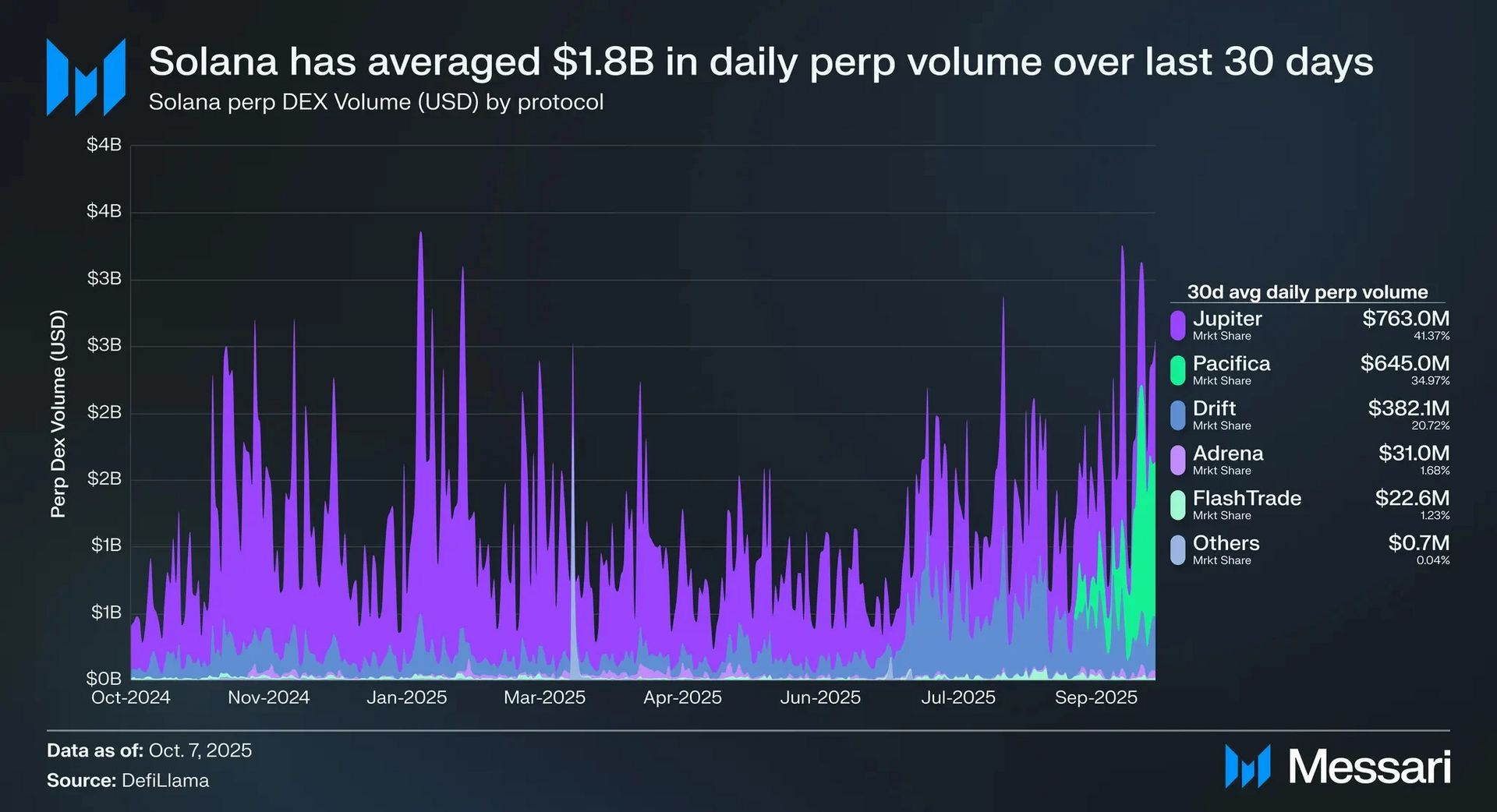 Over the last 30 days, Solana has averaged $1.8 billion in daily perp dex volume. Jupiter was the leader during this time period with $763 million in average daily volume, even though it only allows the trading of BTC, ETH, and SOL. Quietly behind them was Pacifica, which launched mainnet in June and started tracking volume on Sept. 9, 2025. Pacifica averaged $645 million in daily volume over the last month.