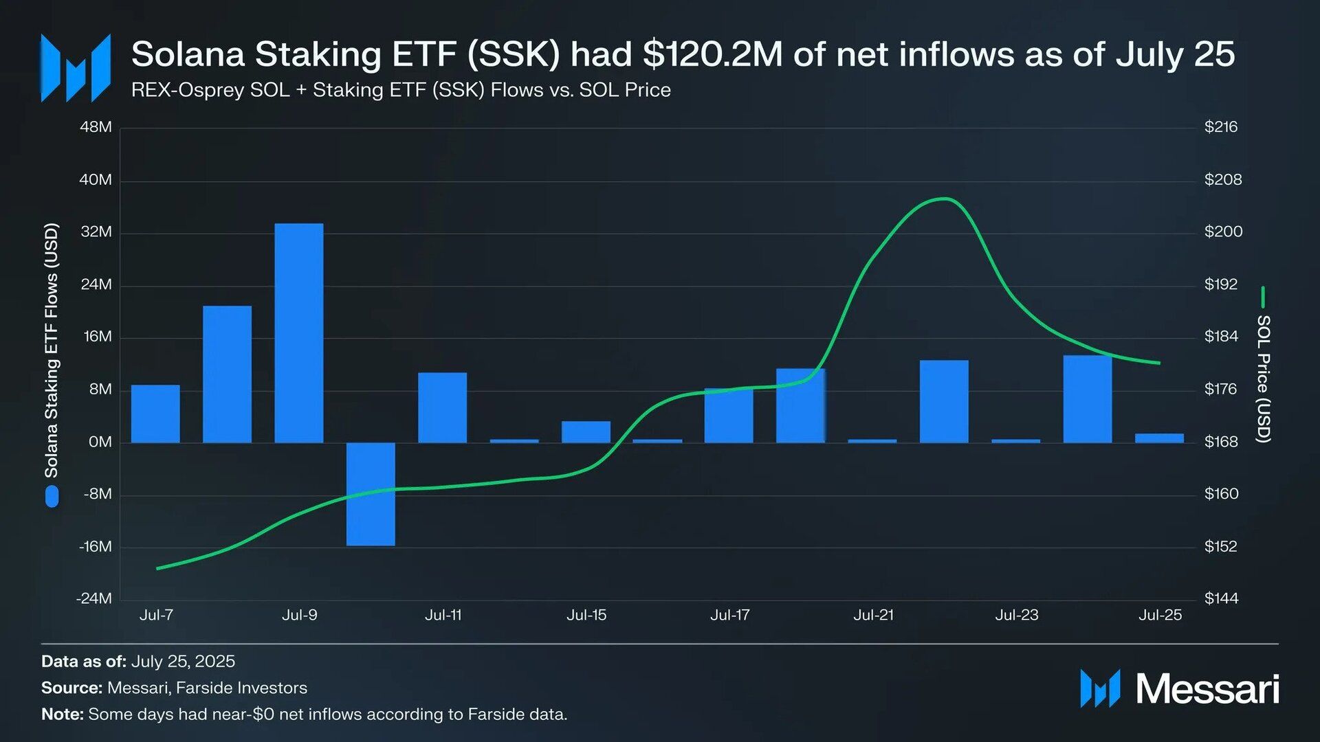 As of July 25, SSK reached $120.2 million of net inflows and has recorded only one day of net outflows (July 10). That kind of consistency is rare, especially compared to ETH ETFs, which had nine days of net outflows in the same time frame (first 17 trading days), albeit this was skewed by the Grayscale ETF’s (ETHE) poor performance. SSK’s early traction speaks to a specific kind of TradFi demand: access to staking yield, minus the headaches of custody, delegation, or validator risk.