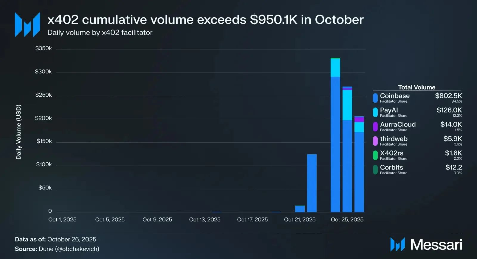 As of October 26, 2025, volume settled by facilitators on x402 has reached $950.1K, with 99.7% of that volume occurring in the past week alone. Coinbase’s facilitator on Base accounted for the majority, roughly 87% ($802.5K) of all flow. PayAI, the multichain alternative, processed approximately $126.0K (8%), suggesting traction among developers seeking Solana or EVM flexibility. AurraCloud registered a sharp late-month climb to $14.0K. Thirdweb and x402rs processed $7.5K combined, serving as entry points for web and Rust developers testing per-call payments, while Corbits handled micro-transactions measured in cents for agentic data access.